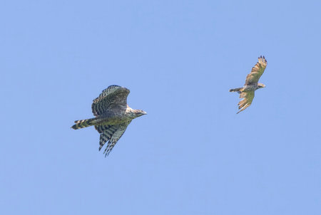 Mountain Hawk-eagle and Grey-faced buzzard in flying in a blue sky background.