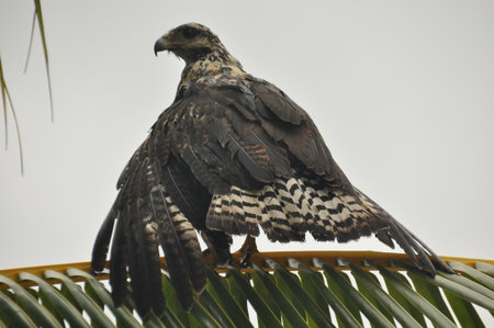 A hawk is seen displaying its wings while perched on a palm tree, surrounded by lush green leaves. It enjoys the sunlight in a tropical setting, showing its natural beauty.