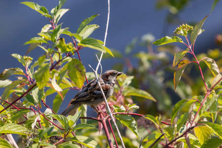 female of small beautiful bird house sparrow, Passer domesticus, bird sitting on the tree branch in winter garden