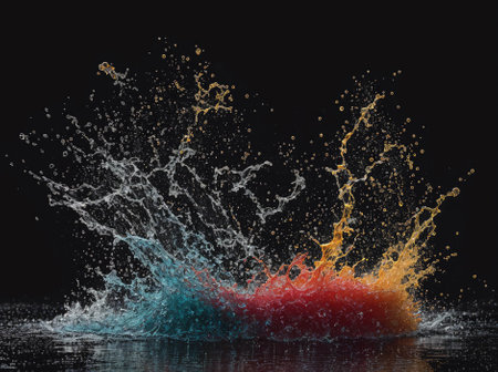 Water droplets burst into colorful splashes against a dark backdrop, creating a mesmerizing display of light and movement, evoking energy and dynamism.