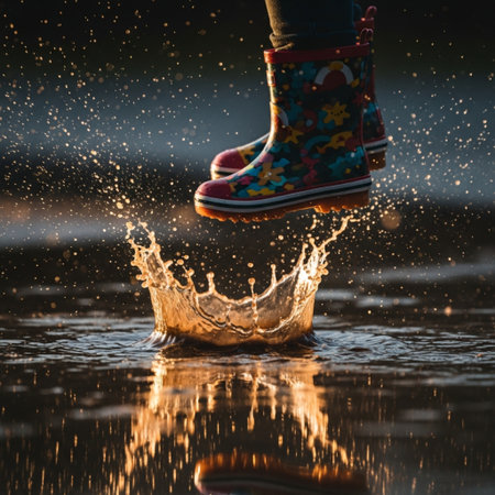 A joyful child jumps in a puddle, creating splashes with their colorful rain boots. The scene captures the essence of childhood fun on a rainy day.