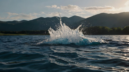 A captivating close-up view of water droplets splashing and creating ripples on a clear surface under soft sunlight, showcasing nature's beauty.
