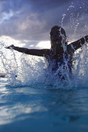 Silhouetted girl splashing in swimming pool, Buonconvento, Tuscany, Italy