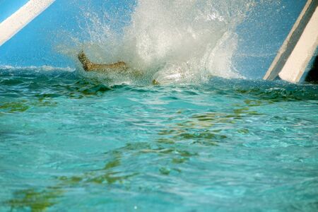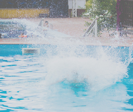 fall in pool. Summer Man Body Sun Skin Care. Beautiful Model With Sexy Body In Swimwear Tanning, In Swimming Pool Water. Fitness Male