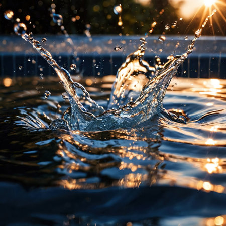 Close up of water droplets splashing in a hot tub at sunset with soft shadows and reflections