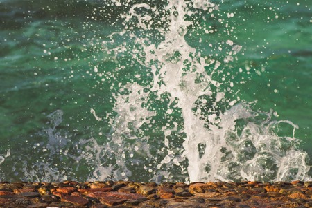 Sunlit waves splashing against rocky shore, creating sparkling droplets