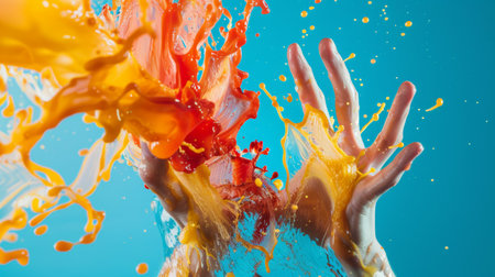 A colorful splash of orange and yellow paint with hands in motion, set against a bright blue background, capturing dynamic energy.