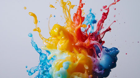 Vibrant explosion of multicolored paints splashing on white background, dynamic and vivid artistry. Creative abstract art and color therapy concept