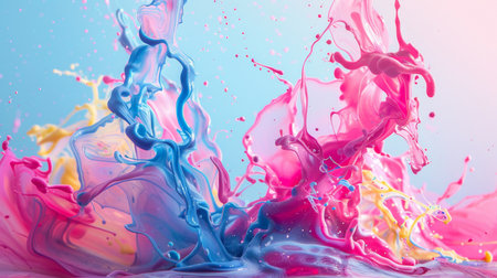 A dynamic and colorful display of paint splashes in motion with vibrant pink, blue, and yellow hues, creating an energetic abstract composition.