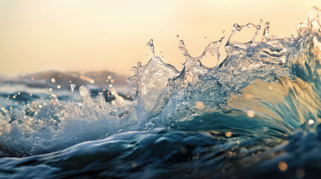 An image captures a wave cresting, showcasing clear water splashing. The visual highlights the dynamic action against a backdrop of a cloudy sky and soft sunlight. This image evokes a sense of freshness and could be used for various projects, including advertising or educational materials.