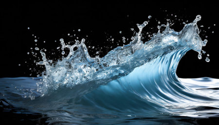 Captivating close-up of a water wave splashing against a dark background, showcasing dynamic movement and sparkling reflections that evoke a sense of tranquility and beauty.