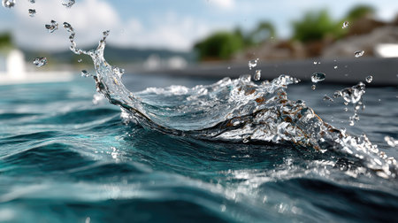 A stunning close-up of water splashing, showcasing droplets glimmering under bright sunlight. This vibrant scene captures the beauty of nature and tranquility.