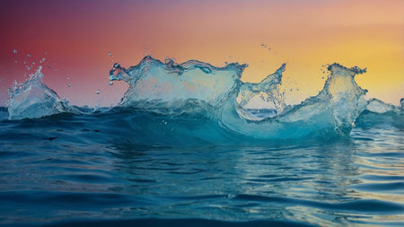 A dynamic image of water splashing in mid-air with glowing reflections from the sunset, symbolizing energy, nature, and motion. Evokes freshness, fluidity, and the beauty of natural elements.