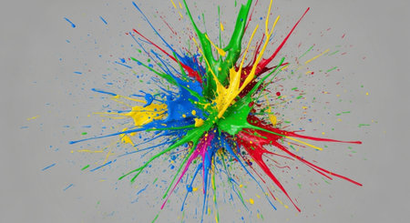 Bright paint splashes exploding outward from a central point, creating a dynamic radial pattern