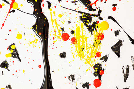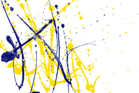 Abstract background of acrylic paint splashes in blue, orange and yellow colors
