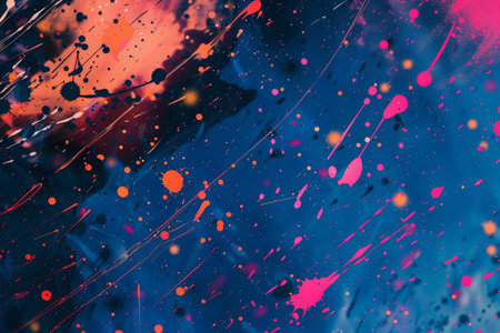 Abstract artwork features a vivid arrangement of multicolored paint splashes. Dynamic diagonal streaks and dots in hues of pink, yellow, orange and black contrast against a vibrant blue background. Suitable for creative projects, design elements, and decorative uses.