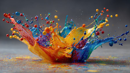 Dynamic Paint Splash Explosion in Motion A high-speed capture of vibrant acrylic paint splashing mid-air in bold primary colors, frozen