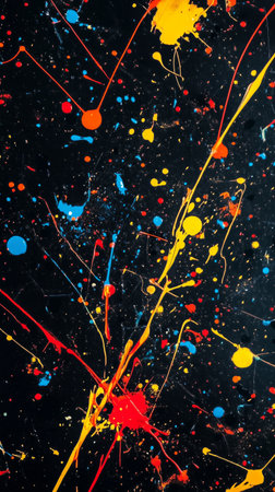 Bright splashes of yellow, red, and blue paint create a dynamic and energetic pattern on a dark canvas.