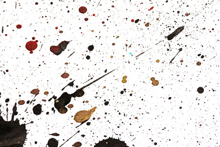 A group of multicolored paint splattered in vibrant red, blue, and yellow hues on a white surface. The paint appears to be randomly splattered, creating a dynamic and colorful composition.