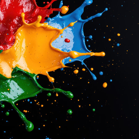 Bright, bold colors mix and collide, creating stunning splashes against a dark background. This energetic display captures the joy of artistic expression through liquid motion.