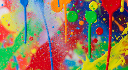 Bright multicolored paint drips and splatters artistic background
