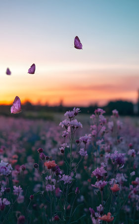 Butterflies flying over a field of purple flowers at sunset.