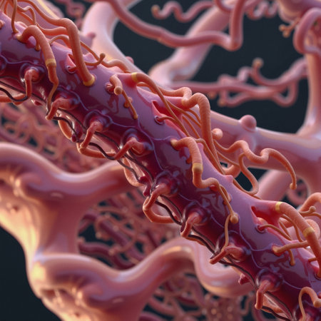 This image features a highly detailed and close-up view of an anatomical or biological structure, primarily composed of a central reddish-brown tube-like form. Numerous curly, elongated appendages protrude from the central form, wrapping and intertwining in complex patterns. The structure resembles microscopic imagery, suggestive of a network of capillaries or a neural formation, with a focus on texture and color that adds an almost surreal quality. The intricate detailing captures the delicate nature of these organic forms, accentuated by varying shades of pink, red, and subtle highlights. The background remains slightly blurred, drawing attention to the foreground elements and contributing to the depth of field. The overall impression is one of scientific intrigue combined with an aesthetic appreciation for the complexity of natural forms.