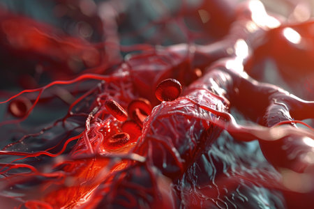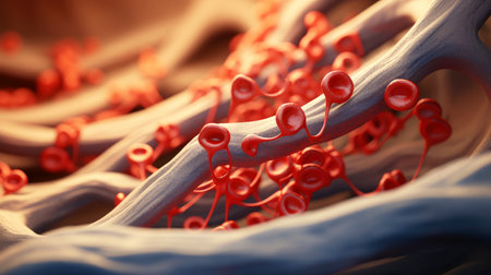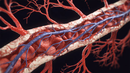 Close-up of blood vessels reveals the intricate network of arteries and veins, showing oxygenated and deoxygenated blood flow.