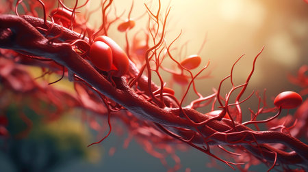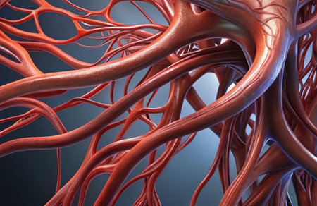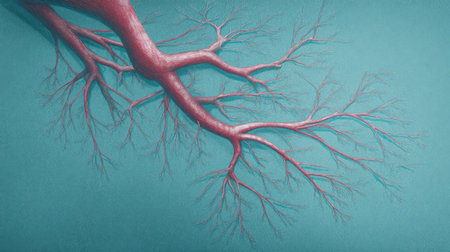 A detailed view of red blood vessels intertwines across a soft gradient background. The intricate network showcases the complexity of human circulation highlighting the various sizes and shapes of the vessels