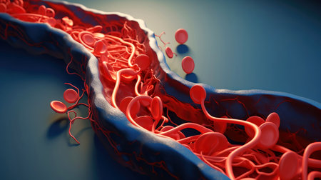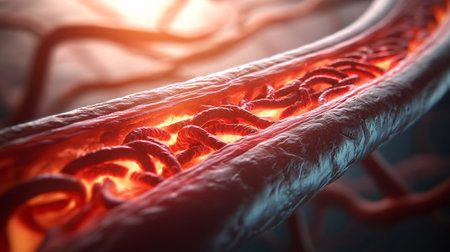 This image presents a detailed visualization of the interior of a blood vessel, showcasing flowing red blood cells and a glowing plasma environment, perfect for medical illustrations.