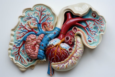 3D illustration mockup of the human organ systems, circulatory, digestive, red and white bloodcells wtih blurred backgroun. Medical education concept, Generative AI illustration