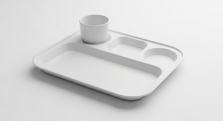 A clean white plastic cafeteria tray with multiple compartments and a matching cup is presented on a bright white background.