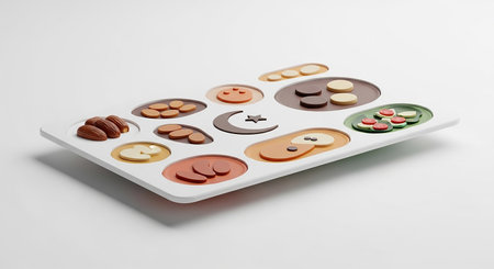 A white serving tray with multiple compartments an assortment of food and Islamic symbols like a crescent moon and star.
