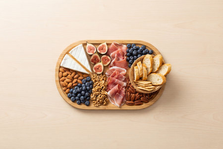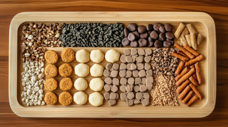 A visually stunning arrangement of various snacks and nuts on a wooden tray showcases a delightful medley of textures and flavors, perfect for sharing.