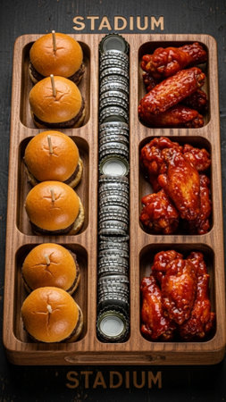 A striking vertical 9:16 shot of a bespoke wooden 'Stadium' serving tray filled with Super Bowl part