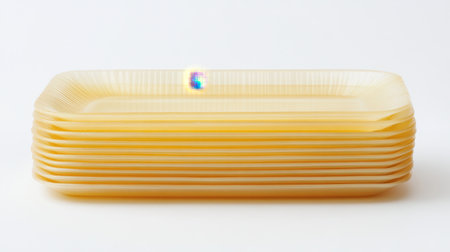 A neat stack of light yellow plastic plates displayed against a white background, perfect for showcasing food, catering, or dining events.