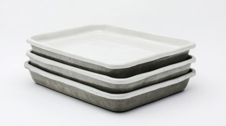 A set of three stacked rectangular baking trays featuring a white ceramic interior and gray stoneware exterior, ideal for modern kitchens. Perfect for various culinary tasks.