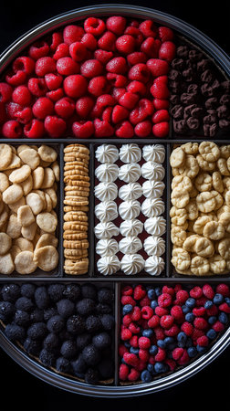 An overhead shot reveals a geometric serving tray, partitioned into sections filled with vibrant fruits and vegetables. The composition features a variety of fresh produce, including citrus fruits, berries, and chili peppers. The scene is brightly lit, showcasing natural textures and colors, suitable for health and wellness themes. It may be used for marketing campaigns or editorial articles.