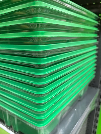 Multiple layers of vibrant green trays are neatly stacked on shelves in a storage area. The orderly arrangement highlights the tray's transparency and vivid color.