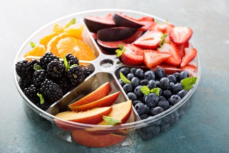 Assorted fruit and berries on a plate with strawberry, peaches, blackberry and orange