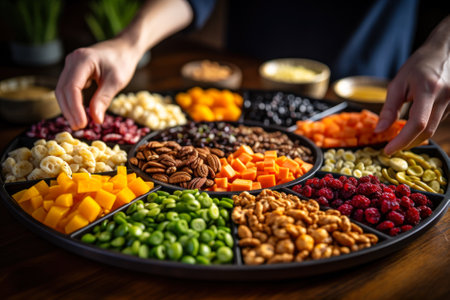 variety of vegan vegetables and nuts on a platter.