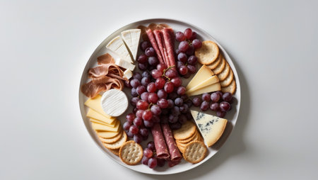 AI Generated. Assorted Cheese and Cured Meat Platter with Grapes and Savory Crackers - Top View
