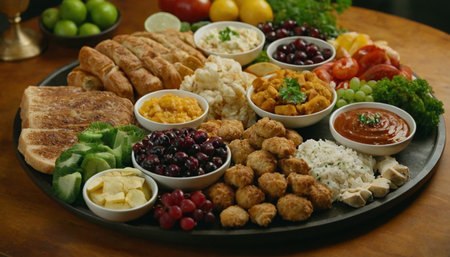 colorful dinner on table with lots of food