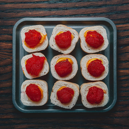 Sandwiches with red caviar and vodka on a tray. On wooden background.