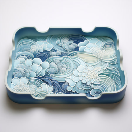 Let your imagination dive into the depths of serenity with this mesmerizing paper tray design featuring an astonishing Ocean Ombre. The tranquil gradient of oceanic blues in this art style captures a combination of realistic elements and the touch of Japanese art influence. The intricate details and soothing color palette of the tray design are sure to captivate viewers and evoke a sense of calm and wonder. Delicate waves, tranquil sea creatures, and ephemeral cherry blossoms can be incorporated into the artwork to add an extra layer of intrigue. This captivating design is perfect for various microstock sites, appealing to a wide range of reactions. Ensure that your creative vision remains original and avoids copyrighted content and trademarks.