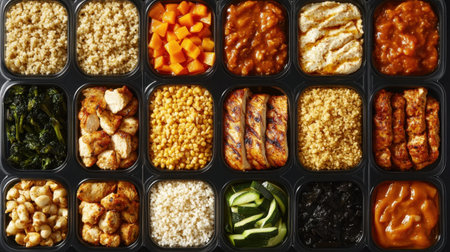 A vibrant display of assorted meal prep containers showcasing grains, vegetables, and proteins. Ideal for promoting healthy eating and convenient meal planning.