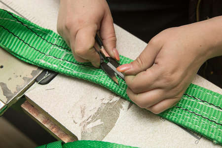 Industrial sewing machine sews a webbing sling. Manufacture of textile slings and tie straps