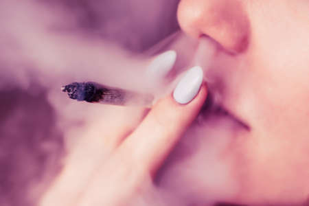 Girl smoking medical marijuana joint outdoors. The young women smoke cannabis blunt, close-up. Cannabis is a concept of herbal medicine.