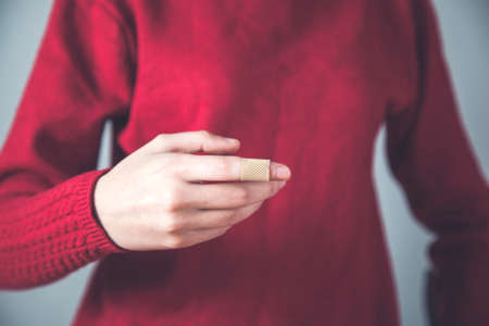 Female hand holding a wooden spoon on a gray background. Selective focus.