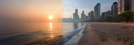 The soft glow of sunrise blends with the striking silhouette of skyscrapers beside a sandy beach, showcasing nature and urban life in harmony.